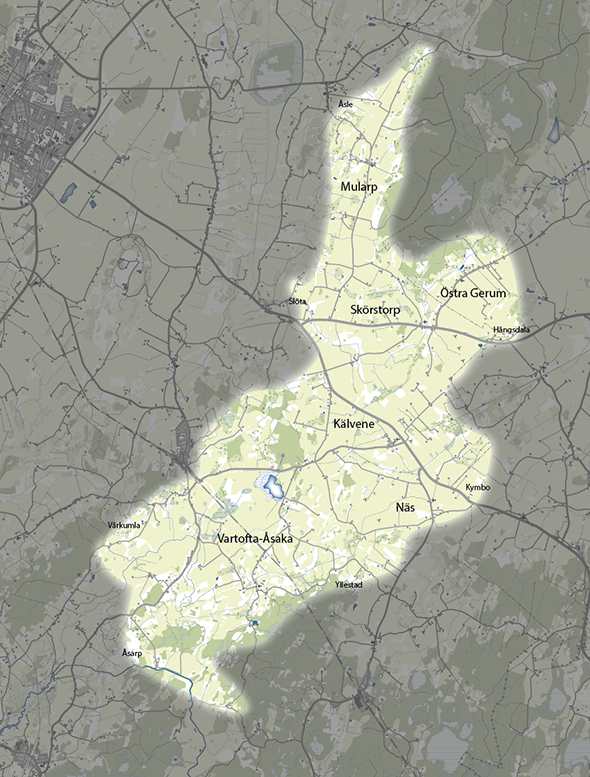 | Föreningens verksamhetsområde planerades från början omfatta det gamla Kälvene telefonnummerområde (32xxx) vilket i huvudsak utgörs av de största delarna av socknarna Skörstorp, Kälvene, Näs och Vartofta-Åsaka.