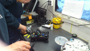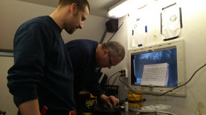 2012-12-15: Här svetsar man fiber vid Smedjan i Brismene. Svetsning låter lite missvisande när man ser hur litet och pilligt det verkar vara. På bilden till höger ser man svetsen och den vita kopplingsdosan, där skarven mellan de två ihopsvetsade fibrerna finns.