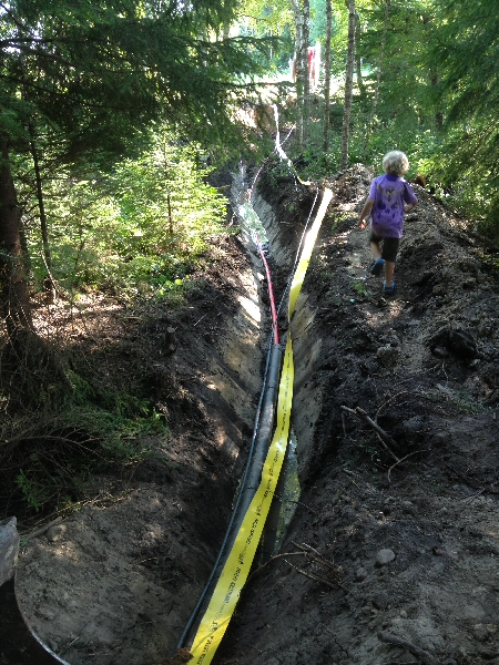 2013-07-22: Nu är man igång och gräver ner kabeln för den sträcka som vi valde att ordna med själva vid Klockaregården.