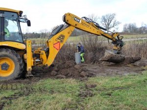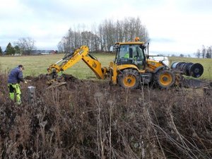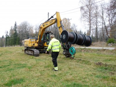 2013-10-18: Då har vi Schaktteknik från Tidaholm på plats. Igår satte Johan och Anders plogen i jorden, de började vid Börstigs telestation och går nu ner genom Tornarp. Arbetet har gått bra och de har hitintills lyckats plöja hela sträckan och är nu precis förbi lilla Kronogården.